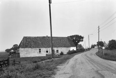 Eenvoudige kop-romp-boerderij met zeer hoge schuur en woondeel met houten deklijst en versierde schoorsteenborden