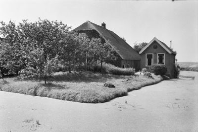 Het Oude Rechthuis: gepleisterd pand met puntgevel, waarin vlechtingen en ontlastingsbogen. Zadeldak, met riet gedekt
