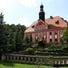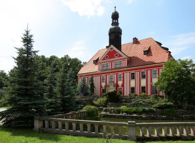 Il palazzo mostra elementi architettonici barocchi con un edificio principale circondato dall'acqua nella Bassa Slesia meridionale.