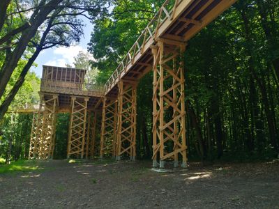 La passerella, costruita nel 2020, rappresenta il secondo percorso tra le chiome degli alberi in Polonia, seguendo modelli delle regioni montane.