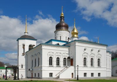 Il Convento Yelizarov si estende a nord di Pskov con diversi edifici in pietra e la Cattedrale dei Tre Santi Gerarchi come struttura centrale.