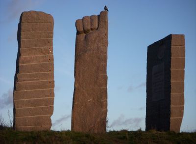 La scultura Protest presenta tre alti blocchi di granito con il blocco centrale modellato come un pugno alzato verso il cielo a Gärdet.