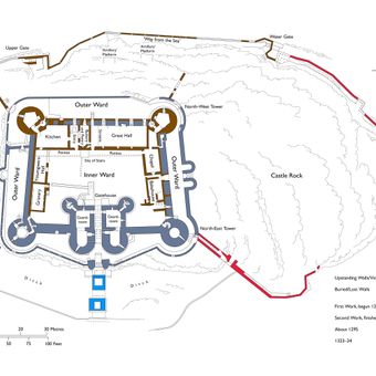 Il castello di pietra sorge su una scogliera rocciosa con due anelli di mura difensive, quattro torri rotonde e un ingresso fortificato.