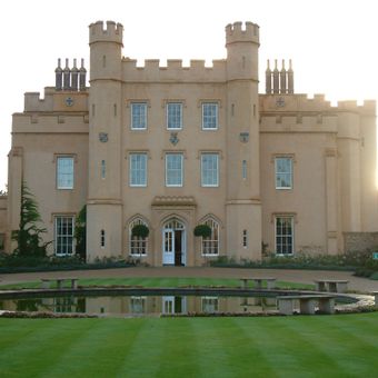 Il maniero neogotico sorge all'interno di un antico fossato e presenta torrette, merlature e un cortile rettangolare murato su 80 ettari di terreno.