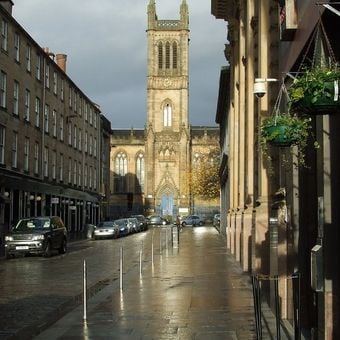 Il Teatro Ramshorn occupa un edificio in stile neogotico al 98 di Ingram Street, con vetrate che raffigurano narrazioni bibliche e dettagli architettonici.