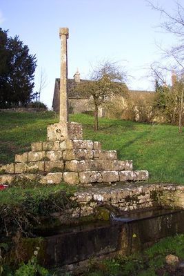 Cross shaft and cross shaft base circa 40 metres south of Number 59, wayside cross in Calmsden, North Cerney, Gloucestershire, England, UK