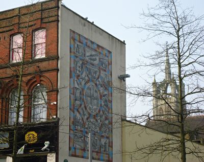 Gli artisti Rob Turner e Gary Drostle hanno creato questa opera murale nel 1994, incorporando immagini della Honeywood House e della chiesa All Saints.