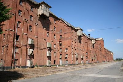 Le Bass Maltings presentano otto padiglioni in mattoni rossi che si estendono per 300 metri con una torre centrale quadrata e un camino industriale.