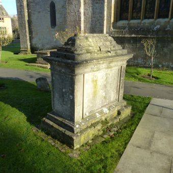 Willson monument in the churchyard approximately 4 metres west of nave to Church of St Mary, Grade II listed chest tomb in Bibury, Cotswold, Gloucestershire, UK