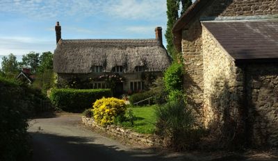 Town's End And Monmouth House, thatched farmhouse in Melbury Osmond, West Dorset, Dorset, UK
