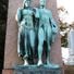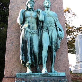Le figure indossano abiti in stile romano con drappeggi arrotolati in vita, riflettendo influenze artistiche classiche nella scultura commemorativa americana.