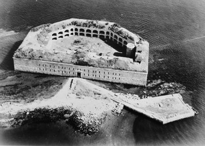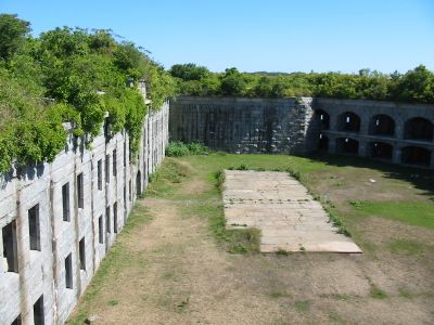La struttura in granito a forma di D su Hog Island Ledge contiene 56 postazioni di cannoni e tre livelli di camere.