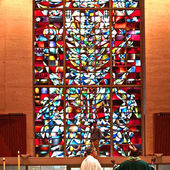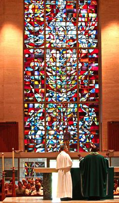 L'Abbazia di San Norberto si estende su 160 acri a est del fiume Fox, con vetrate moderne e costruzione in pietra calcarea.