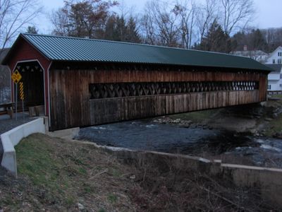 Il Ponte Coperto Ware-Hardwick si estende per 137 piedi sul fiume Ware, con rivestimento in assi verticali e tetto metallico a due falde.