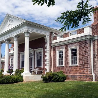 La dimora georgiana si estende per una sola stanza di profondità con un portico sorretto da colonne corinzie rivolto verso il ruscello Whitehall.