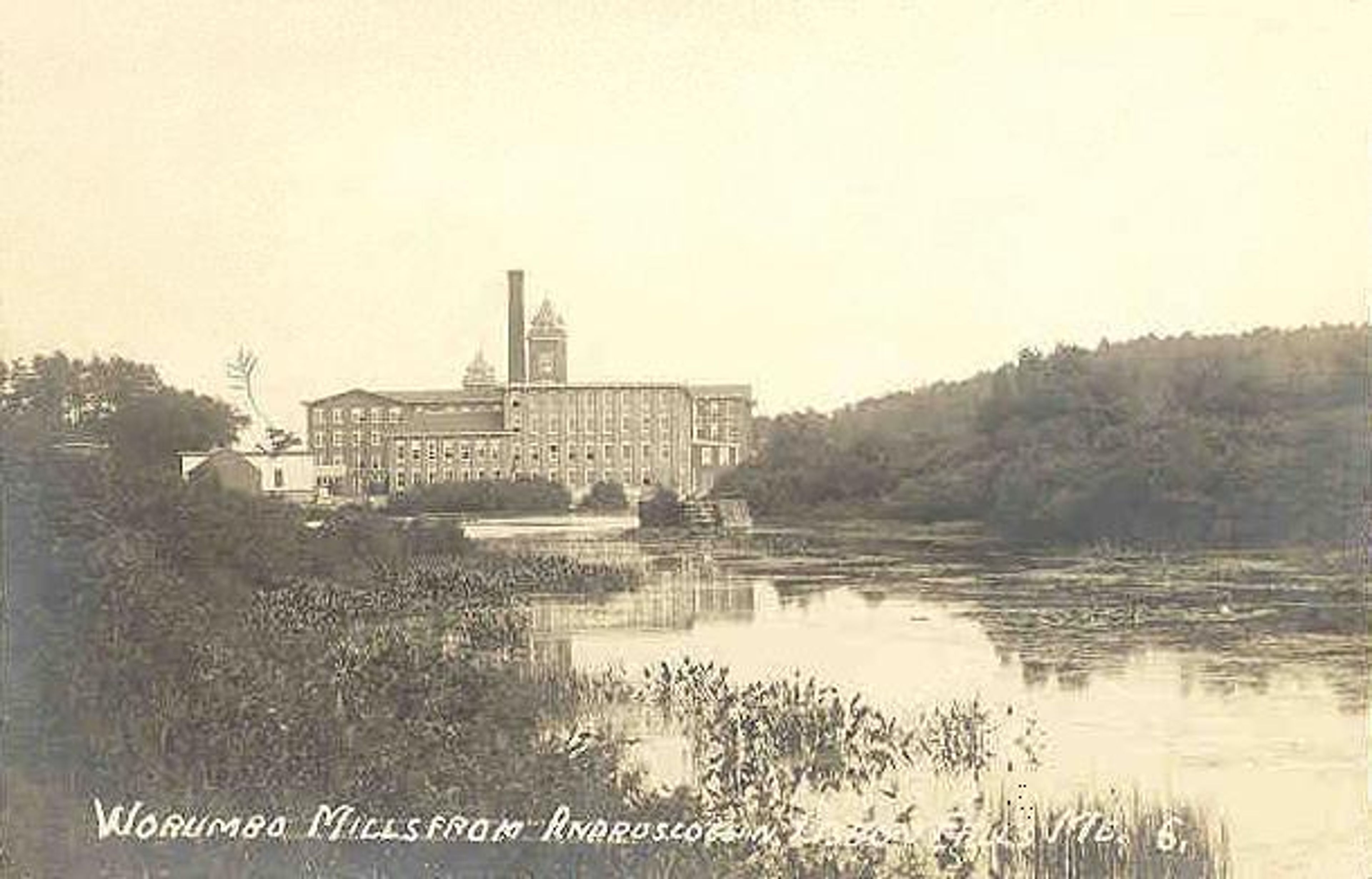 Il Mulino Worumbo sorge lungo il fiume Androscoggin, con edifici in cemento del 1920 e resti della sua infrastruttura tessile.