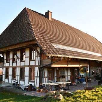 Farmhouse, rural half-timbered house in Hermrigen in the canton of Bern, Switzerland