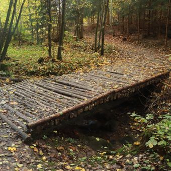Lávka přes Lázný potok u Doubravčic, lávka žlutě značené trasy cca 150 m před ústím do Šembery
