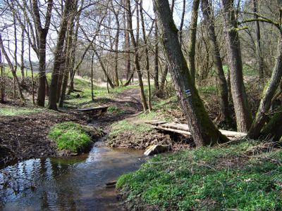 Lávka přes Mokřanský potok u samoty Gabrhele u soutoku, dřevěná lávka na modře a žlutě značené turistické trase