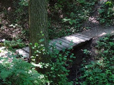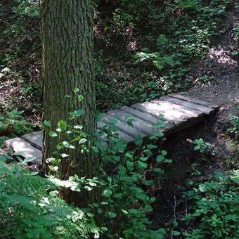 Lávka přes potůček pod zříceninou Libštejn, dřevěný mostek u odbočky ke hradu