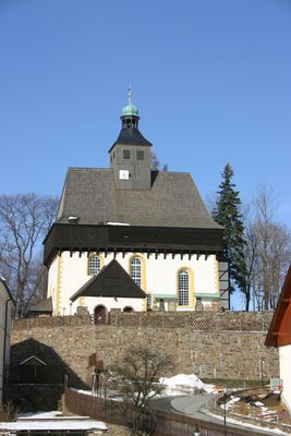 Costruita nel XV secolo e ricostruita dopo le guerre hussite, questa chiesa è una delle quattro chiese fortificate rimaste nei Monti Metalliferi.