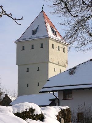 Wasserturm, mehrgeschossig, verputzt, mit auskragender Wasserstube, Zeltdach, erbaut 1923
