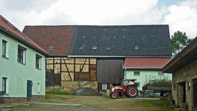Seitengebäude und Scheune eines Dreiseithofes Richard-Wagner-Straße 46, Seitengebäude Obergeschoss Fachwerk, Fachwerk-Scheune, ortsbild- und strukturprägender Bauernhof, wirtschaftsgeschichtliche und baugeschichtliche Relevanz. Stallscheune mit Dachüberstand, Obergeschoss Fachwerk (Lehmausfachung), EG: Fenstergewände
