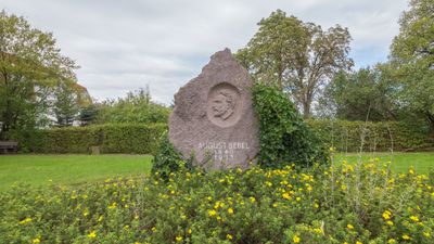 Neusörnewitz Försterstraße 11, Gedenkstein mit Relief und Inschrift, anspruchsvoll gestaltet, charakteristisches Beispiel für die Erinnerungskultur in der DDR, Relief Teil des Oeuvres von Paul Börner, einem bedeutenden Porzellangestalter der Meißner Manufaktur, geschichtlich vo
