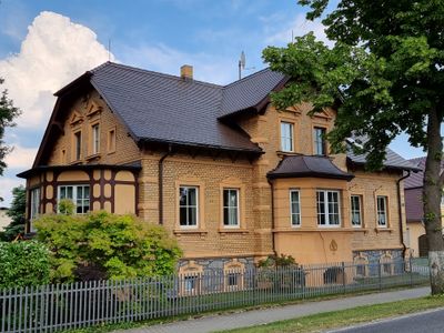 Groß Särchen, Hauptstraße 35, Aufwendig gestalteter villenartiger Klinkerbau, baugeschichtlich und straßenbildprägend von Bedeutung, eingeschossig, gelber Klinker, hohes Natursteinsockelgeschoss mit Fenstern mit Blendsegmentbogen mit Schlussstein, im Hauptgeschoss profilierte G