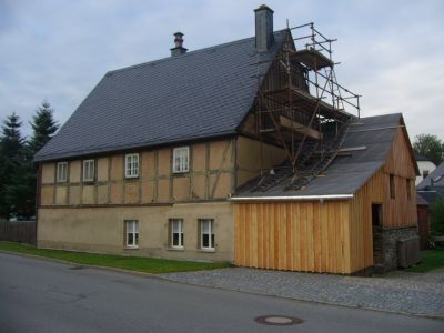 Wohnhaus Karlsbader Straße 25, Obergeschoss Fachwerk, Zeugnis der älteren Generation regionaltypischer Holzbauweise, baugeschichtlich von Bedeutung EG massiv, geglättet, Obergeschoss-Fenster originale Größe, Holzkonstruktion authentisch, einriegelig, Eckstreben, steiles Sattel