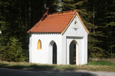La Hubertuskapelle sorge con il suo tetto rosso in scandole e una piccola torre lungo la strada statale 2080 nell'Alta Baviera.