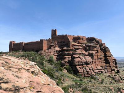 Le mura del castello si fondono con le formazioni rocciose naturali della Sierra Menera, creando una struttura che emerge dalle scogliere rosse.
