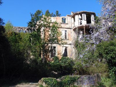 La struttura mostra segni di deterioramento, con vegetazione che copre parti sostanziali dell'edificio e accesso limitato per problemi strutturali.