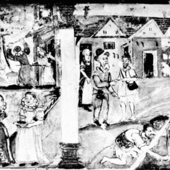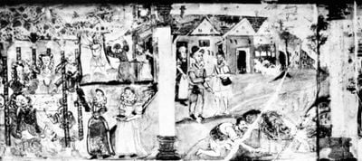 Il primo piano contiene dipinti murali del 1590-1610 che raffigurano quattro pannelli della parabola del Figliol Prodigo con fregi floreali.