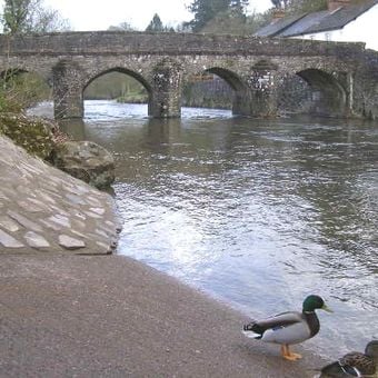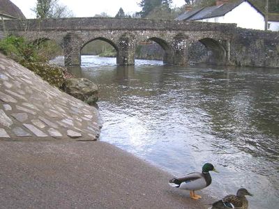 Il ponte in pietra a cinque campate si estende sul fiume Barle con anelli ad arco doppi sul lato a valle e anelli singoli a monte.