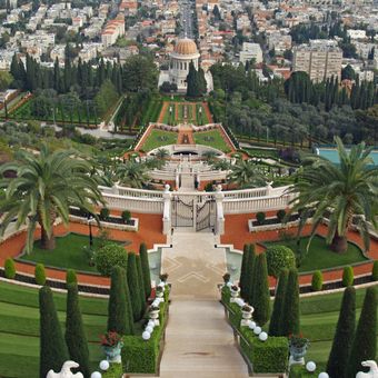 Il Centro Mondiale Bahá'í comprende diversi edifici distribuiti sul Monte Carmelo, con strutture in marmo bianco e diciannove terrazze giardino che salgono sulla montagna.