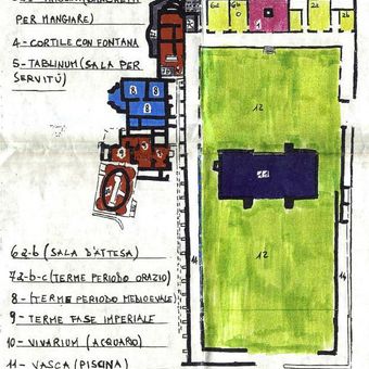 Il complesso della villa romana misura 43 per 113 metri, con quartieri residenziali, giardini circondati da portici e un complesso termale sul versante orientale del Colle Rotondo.