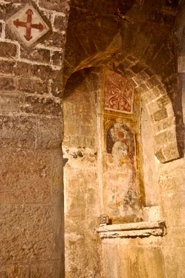 Gli spessi muri interni suggeriscono che la sua funzione iniziale fosse una torre difensiva prima della trasformazione in struttura religiosa.