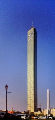 La Torre Dorata raggiunge un'altezza di 158 metri e presenta 7.000 mezzi specchi sul suo esterno che riflettono la luce solare nell'area.