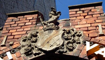 August Volz sculpture 'Man with jugs', coat of arms embossing, Latvian cultural monument No. 7283