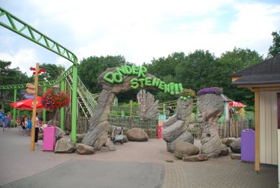 Le montagne russe Donderstenen incorporano grandi strutture di pietra lungo il percorso, con numerose curve e discese durante il tragitto.