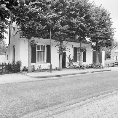 Gepleisterd dwarshuis onder rieten zadeldak tussen puntgevels. In de voorgevel vensters met luiken en negenruitsschuiframen