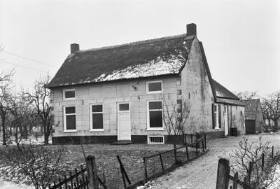 Gepleisterde boerderij; Rieten zadeldak; gesneden deur