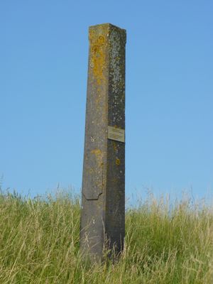 Op de dijk naar Warder een grenspaal in de vorm van een obelisk