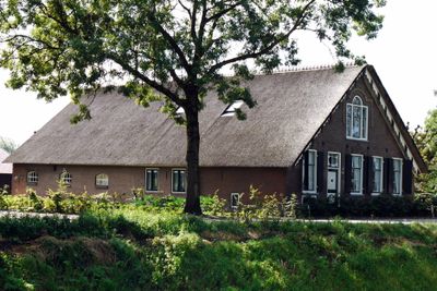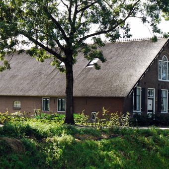 Boerderij, dwarshuis, gepleisterd, topgevels, dak rietgedekt