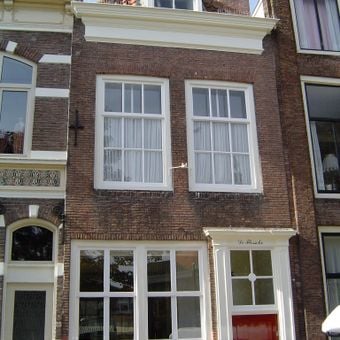 Huis met geverfde lijstgevel. Kroonlijst voorzien van drie tandlijstjes. Dakkapel met tandlijstje. Eenvoudige voordeuromlijsting met bovenlicht en kalf met twee tandlijstjes. Stoeptreden