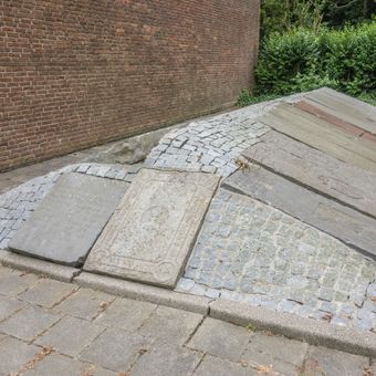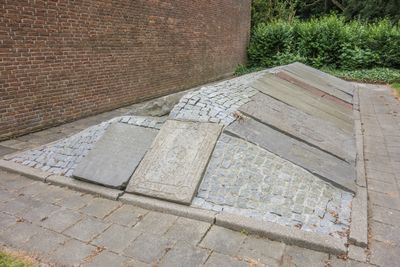 Twee rijen grafzerken, op het oude kerkhof bij de ingang van de moderne kerk