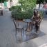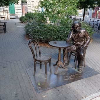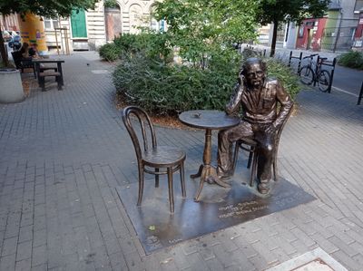 La sedia vuota di fronte alla statua permette ai visitatori di sedersi e interagire con la rappresentazione dell'artista.