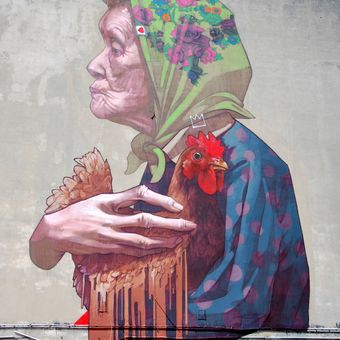 Madame Chicken, mural in Lodz at 16 Politechniki ave