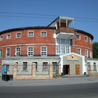 Il bagno pubblico in mattoni sulla via Lenina presenta forme geometriche ed elementi funzionali caratteristici dell'architettura sovietica iniziale.